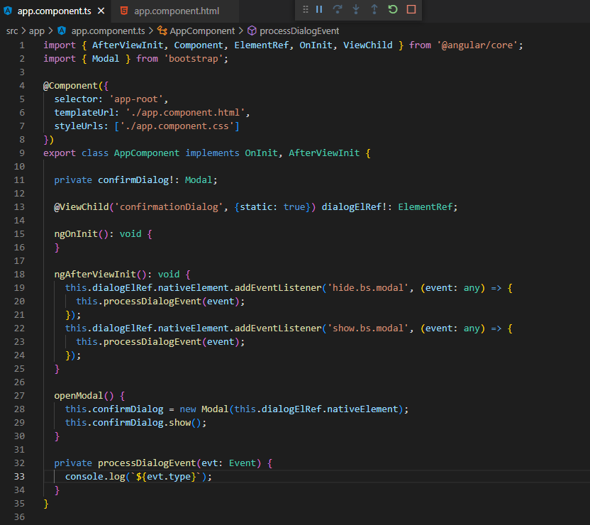 Some points to note in the above code… We’ve introduced the Angular property decorator @ViewChild(…) - this has enabled us to stop passing in the element from the template via the template variable as we were originally doing. We’ve also added some code to our ngAfterViewInit lifecycle method, which is responsible for listening to the ‘show’ and ‘hide’ events - simply logging the ‘type’ property associated with the Event via the processDialogEvent() method.