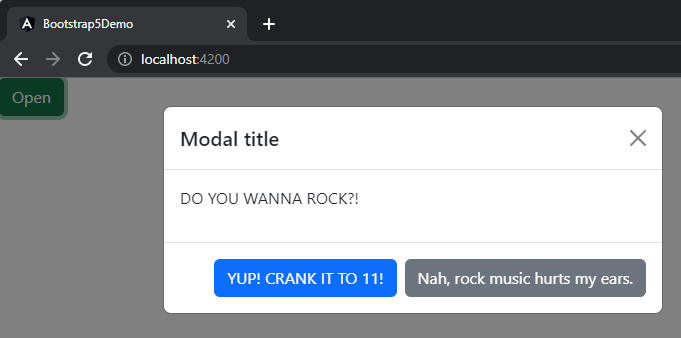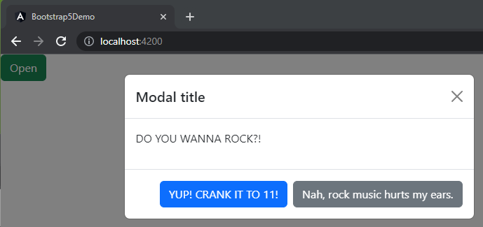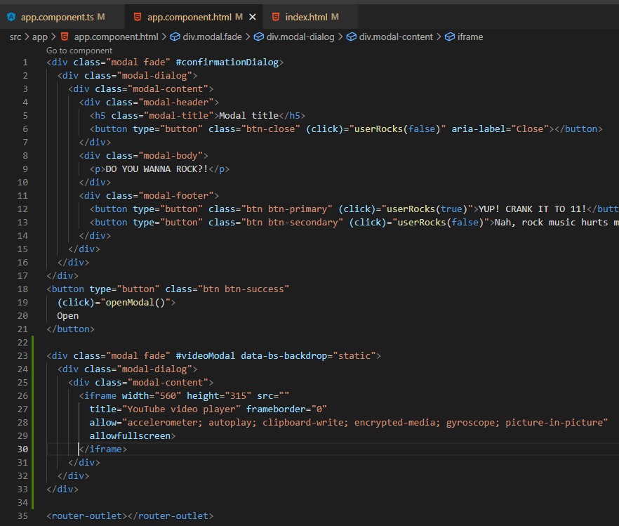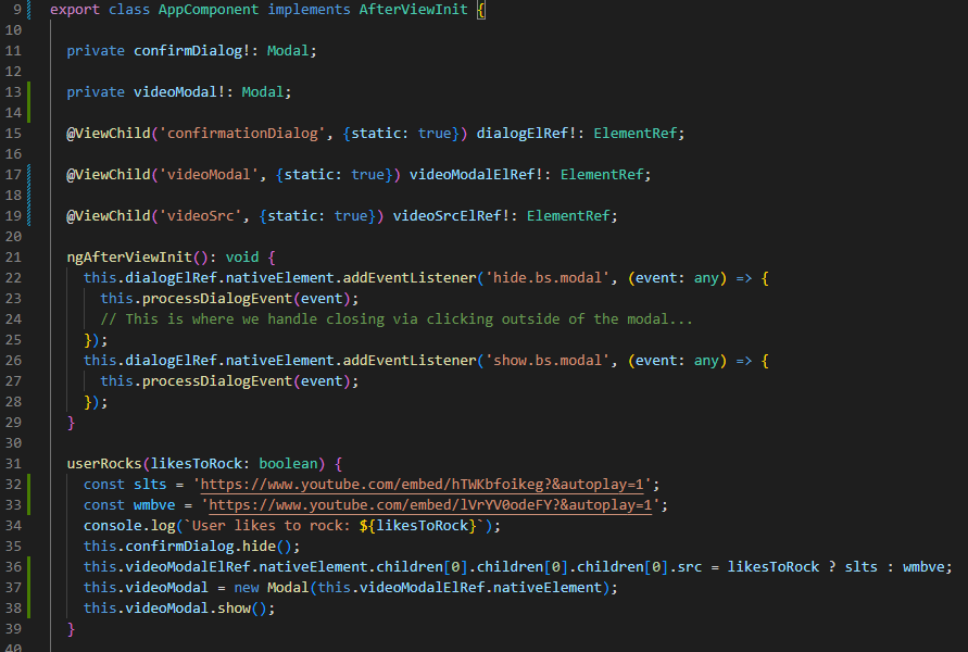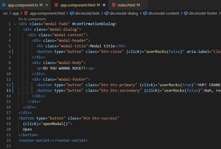 For the sake of brevity (🤣🤣🤣 Never been a strong suit of mine), we’re just going to introduce a few lines of code to our userRocks method and some supporting code to our AppComponent implementation. Namely, we’re going to add another Modal (why not?! This is a Modal example, afterall!) as well as another ViewChild that makes accessing an element within the Modal a bit easier so that we can mess with it in our userRocks() method based on the user’s input.