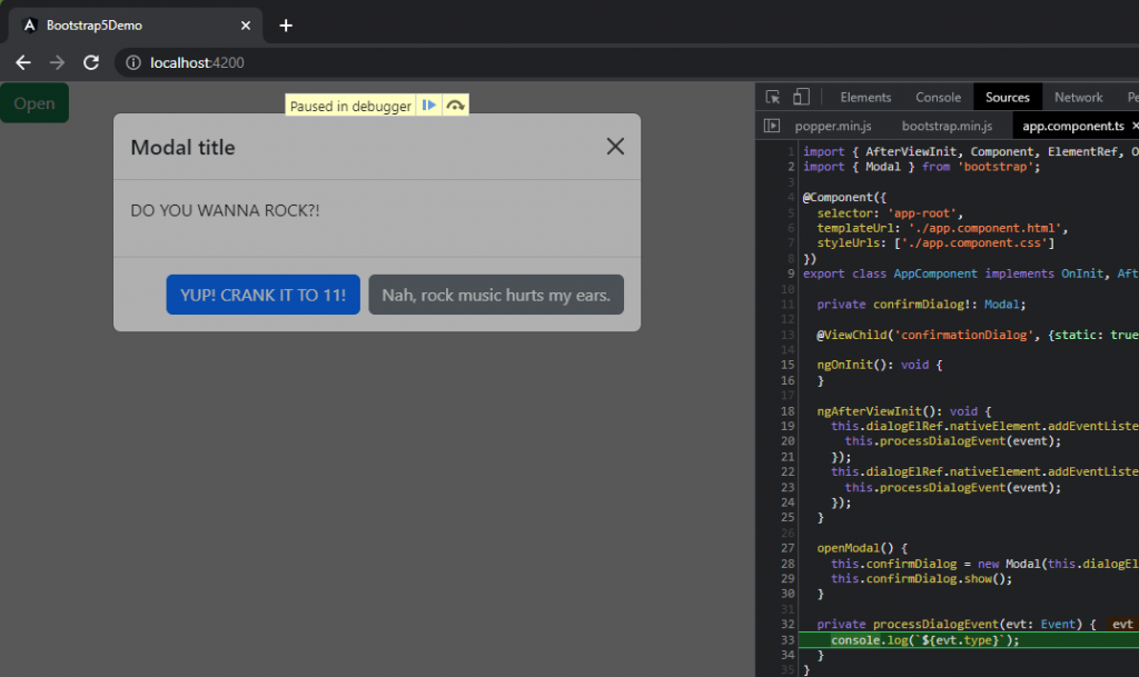 As you can see in the above code, we’re able to simply create a Modal instance in TypeScript-land thanks to our @types/bootstrap library -then we can simply call ‘show()’ to open our new Modal: