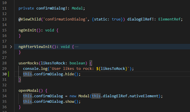 To get our Modal setup, we’re going to utilize the AfterViewInit lifecycle hook to wire up our event listeners so that we can respond to our Modal instance: