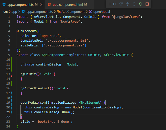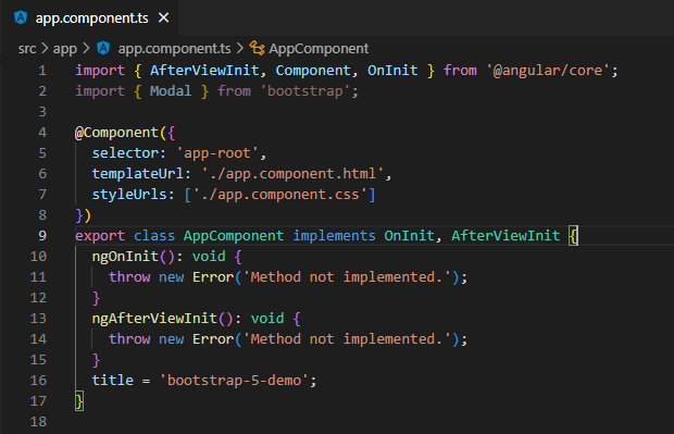 Now that we have the basics set up, let’s start in our AppComponent by importing Modal from bootstrap (via the @types/bootstrap package installed in the previous step):