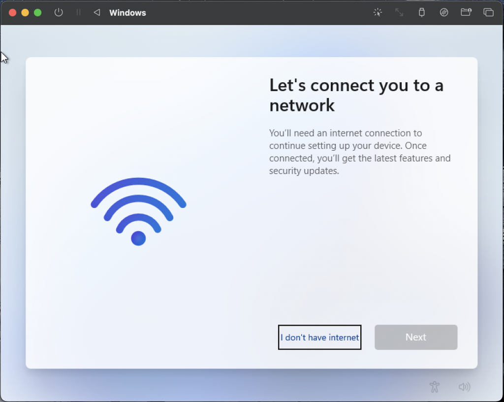 The Windows 11 image should restart and the setup process should restart - once you progress to the Network screen, you should now see a new option - ‘I don’t have internet’ (anyone notice how poorly styled that is? It’s like MS doesn’t like this option or something…):