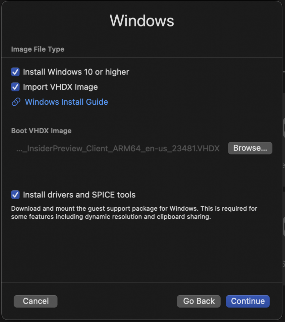 Ensure you click ‘Import VHDX Image’ and then click ‘Browse…’ and browse to the Windows 11 VHDX that took one million years to download the last time you tried to complete this tutorial before ultimately walking away and forgetting that you were trying to get Windows running on your MBP M1/M2: