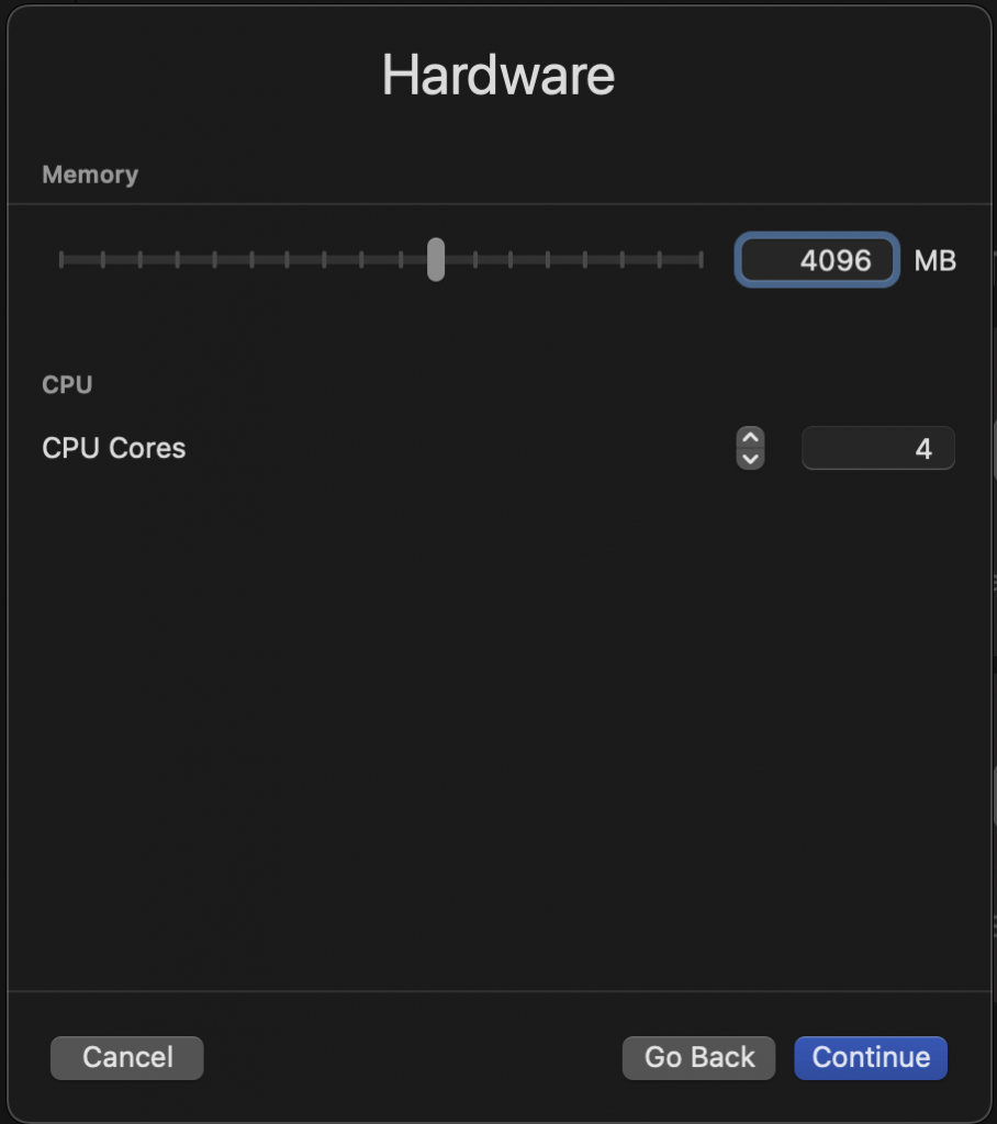Click ‘Continue’ to proceed to configuring your memory and CPU allocation - I’m opting for defaults because I want Windows 11 to run like garbage and to be painfully slow: