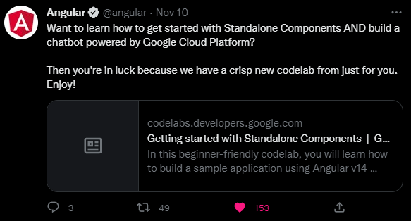 Since I follow the official Angular Twitter account, I recently saw a link to this tutorial shared and so I figured it would be a good place to start: https://codelabs.developers.google.com/angular-standalone-components