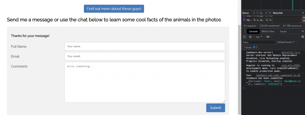 Another small note to make… Once you get to the ‘Add event handling to the form’ section, step 4 of the ‘Add the send message form model to the component’ subsection instructs us to remove the default constructor: