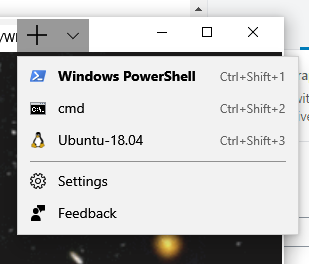 Towards the top right of your terminal window, you should see a ’+’ and down arrow. Fortunately for me, Windows Terminal picked up all of my currently installed CLIs - PowerShell, CMD and Ubuntu Bash via WSL. If I want to open up another instance of the default CLI (PowerShell for me), I can simply click the ’+’ and it will open a new tab with a new CLI instance! Additionally, key bindings are likely similar to what you’re used to in other apps - CTRL+T to open a new tab, and CTRL+W to close the current tab.