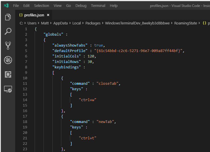 But what if Windows Terminal didn’t pick up all of my CLIs? Or what if I add additional CLIs (say via different Linux subsystems)? Enter ‘Settings’. When you click settings, you’re likely to be prompted for which viewer/editor you would like the profile config file to be opened with - in my case, I just went with the suggestion default of VS Code. Once open, you will see a JSON file containing the default configuration for Windows Terminal similar to the following: