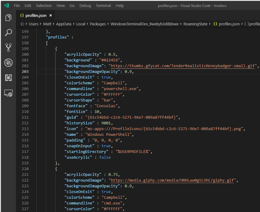 To get started, we need a new property in our profile config - “backgroundImage”. This string value may point to a local image file, or (best I can tell) any network accessible image file that your little heart desires… But who really cares about regular old static images anyways? What is this? 1999? Fortunately, not only are static images supported but so are ANIMATED GIFS!!! By setting the value of this property to a path string to an animated gif, we are enabled to razzle-dazzle all inferior onlookers with our clearly superior terminal.