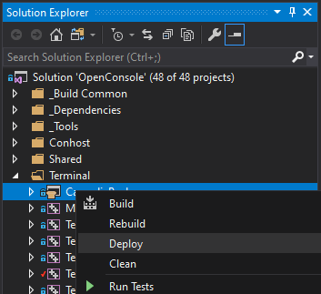 If you’re like me, you found yourself doing a victory lap after CTRL+Shift+B didn’t blow up your PC. If you’re like me, then you likely found yourself scratching your head about which one of the many build output artifacts you should be haphazardly clicking on in order to see your awesome new Windows Terminal. The answer: “None of them”. Something that wasn’t quite clear to me was that the application actually needs to be locally deployed in order to properly run. To deploy, simply right-click the ‘CascadiaPackage’ project and then click ‘Deploy’. Note: If you’re following the instructions, you’ve enabled Developer Mode, which is required - if you’re not following the instructions, then shame on you.