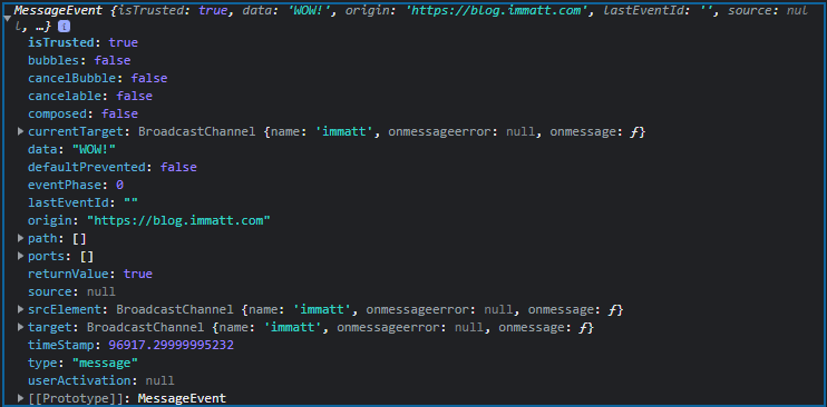 Here’s the expanded console object of the recieved message for a better look at the MessageEvent payload: